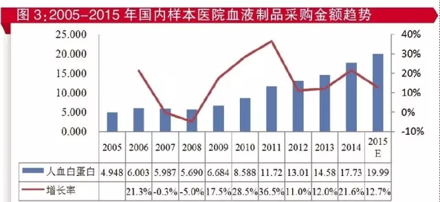 據(jù)PDB數(shù)據(jù),預計2015年樣本醫(yī)院血液制品采購金額合計約35億元,2005-2015年樣本醫(yī)院血液制品采購金額趨勢見圖3,10年間年復合增長率為16.7%。