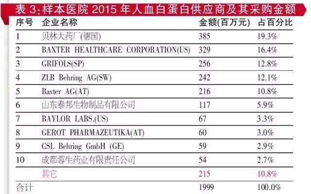 據(jù)PDB數(shù)據(jù),2015年樣本醫(yī)院人血白蛋白供應商有32家,前10家采購金額及其所占份額見表3。