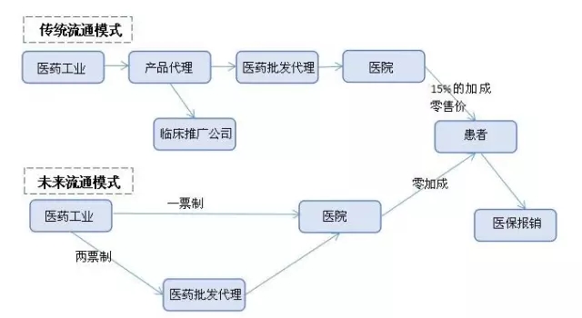 相比之下,在未來的流通模式中,兩票制砍去了產(chǎn)品代理這一環(huán)節(jié),藥品從出廠到醫(yī)院只許開兩次發(fā)票,一是從生產(chǎn)企業(yè)到流通商業(yè),二是從流通商業(yè)開到醫(yī)院,并且取消藥品加成。