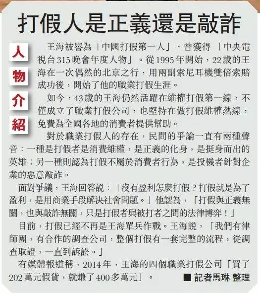 話說回來,如果中國各行業(yè)準(zhǔn)入嚴(yán)格、管理規(guī)範(fàn)、監(jiān)管得力、執(zhí)業(yè)標(biāo)準(zhǔn)、懲處及時,這個社會也許將不再需要王海這樣的職業(yè)打假人。願中國再無王海。