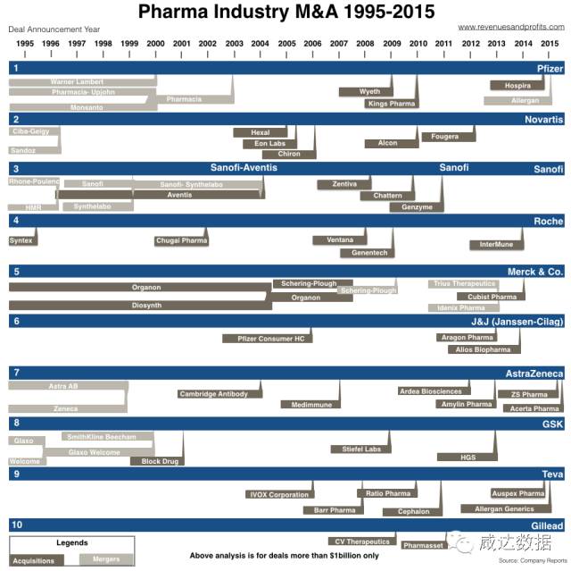 下面將著重對(duì)1995年至2015年這二十年間并購(gòu)活躍的全球十大制藥公司10億美元以上的重大交易進(jìn)行梳理。