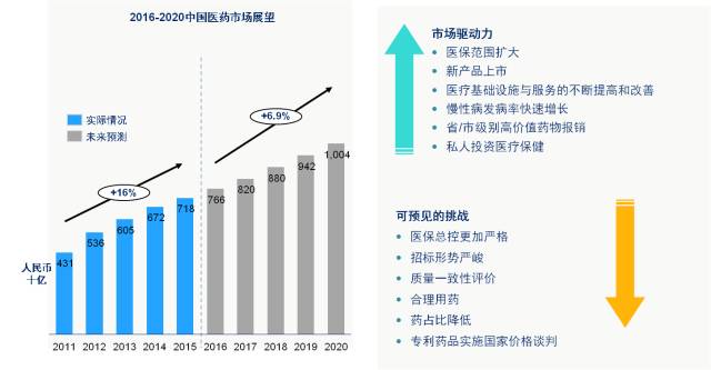基于目前可預見的各種挑戰(zhàn),IMS Health對于中國醫(yī)藥市場的未來幾年增長預測趨于謹慎:預計2016至2020年中國醫(yī)藥市場將增長6.9%。