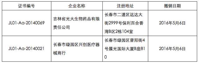 此外,5月6日,吉林省食品藥品監(jiān)督管理局發(fā)布《關(guān)于撤銷吉林省光大生物藥品有限責(zé)任公司等2家企業(yè)GSP認(rèn)證證書的公告》(2016年第10號(hào))。公告稱,吉林省光大生物藥品有限責(zé)任公司、長(zhǎng)春市綠園區(qū)興創(chuàng)醫(yī)療器械商行嚴(yán)重違反《藥品經(jīng)營(yíng)質(zhì)量管理規(guī)范》規(guī)定,依據(jù)《藥品經(jīng)營(yíng)質(zhì)量管理規(guī)范認(rèn)證管理辦法》第四十五條及國(guó)家食品藥品監(jiān)督管理總局《關(guān)于嚴(yán)格執(zhí)行<藥品經(jīng)營(yíng)質(zhì)量管理規(guī)范>加強(qiáng)藥品批發(fā)企業(yè)監(jiān)督檢查工作的通知》(食藥監(jiān)藥化監(jiān)〔2015〕85號(hào))規(guī)定,依法撤銷其《藥品經(jīng)營(yíng)質(zhì)量管理規(guī)范認(rèn)證證書》,現(xiàn)予以公布。