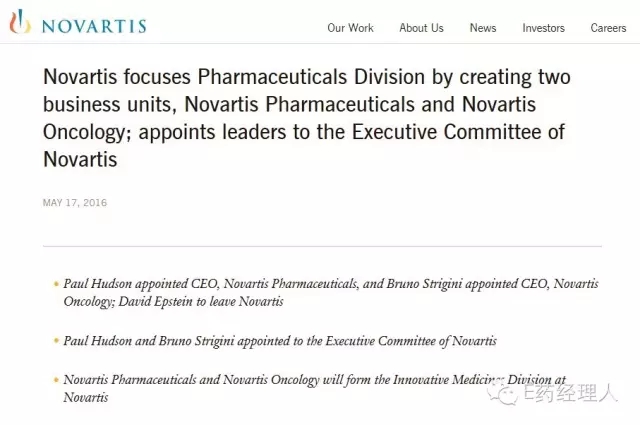 諾華全球官網(wǎng)的最新消息:2016年7月1日開(kāi)始,諾華制藥部門將拆分為諾華制藥業(yè)務(wù)和諾華腫瘤業(yè)務(wù)兩個(gè)單元,CEO David Epstein將離職。