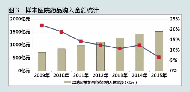 據中國醫(yī)藥工業(yè)信息中心PDB數據庫統(tǒng)計,2015年22城市樣本醫(yī)院藥品購入金額同比增長為6.58%,比去年同期下降5個百分點。