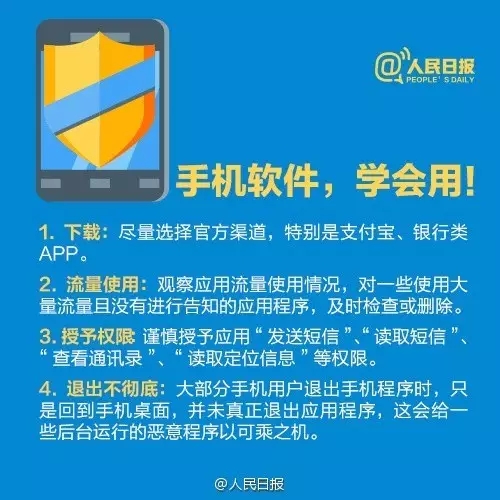 手機(jī),已成為賬本、錢包,并有各類私人信息。一個小小的漏洞,就可能導(dǎo)致巨大損失。提醒:①不要隨意點手機(jī)短信中的鏈接;②謹(jǐn)慎授予應(yīng)用“讀取定位信息”等權(quán)限;③火車票、登機(jī)牌、親人照片等,不要隨意曬……安全用網(wǎng)↓轉(zhuǎn)發(fā)擴(kuò)散!