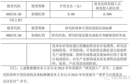 2015年度同行業(yè)上市公司恒瑞醫(yī)藥的資本化研發(fā)投入占研發(fā)投入的比例及相應(yīng)研究階段和開(kāi)發(fā)階段的具體標(biāo)準(zhǔn)情況如下: