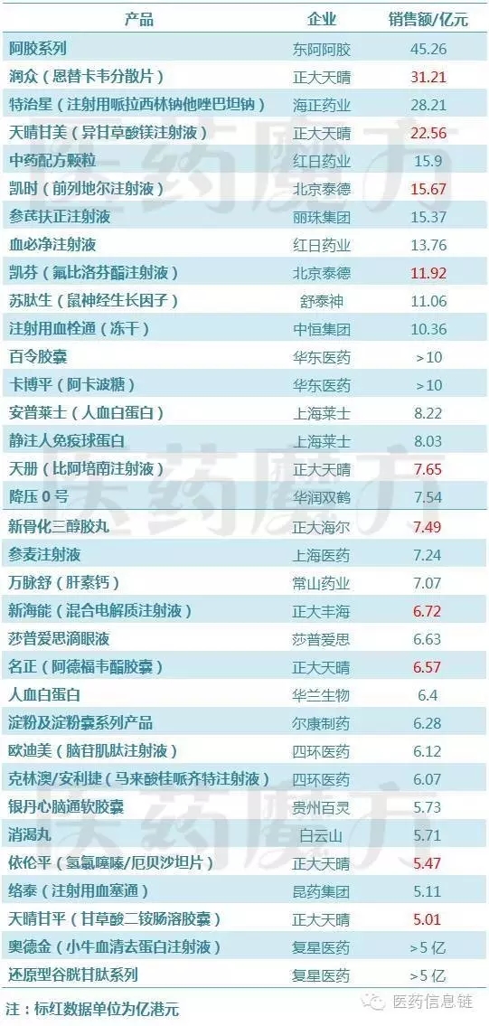 根據(jù)上市公司財報公開披露的現(xiàn)有信息,2015年銷售額超過5億元的國產(chǎn)藥品包括但不限于以下23家藥企的34個: