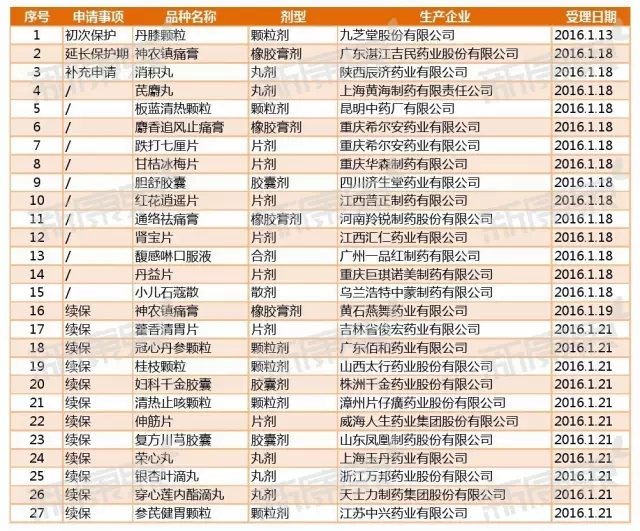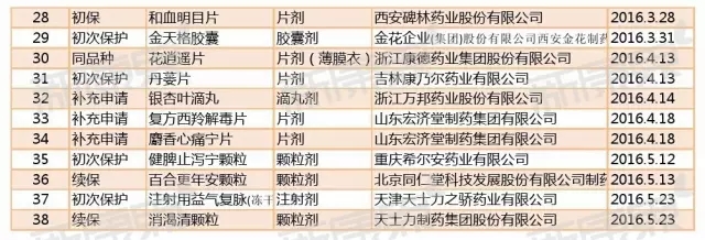 截至2016年5月24日,CFDA發(fā)布中藥品種保護受理公示共11條,共有38個品種,其中6個品種為初次申請保護。