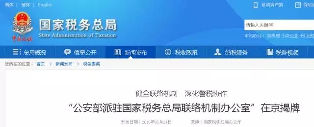 5月24日,“公安部派駐國(guó)家稅務(wù)總局聯(lián)絡(luò)機(jī)制辦公室”揭牌儀式在國(guó)家稅務(wù)總局舉行,此舉是公安部、國(guó)家稅務(wù)總局貫徹落實(shí)中央《深化國(guó)稅、地稅征管體制改革方案》的重要舉措,標(biāo)志著警稅協(xié)作防范和打擊涉稅違法犯罪進(jìn)入了新的階段。