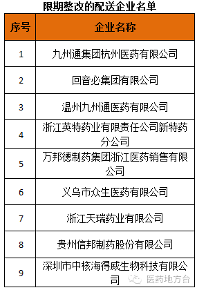 二、限期整改。因企業(yè)訂單操作不規(guī)范、配送不及時以及區(qū)域選擇性供貨等原因,造成配送率未達標,給予九州通集團杭州醫(yī)藥有限公司等9家企業(yè)限期整改的處理。整改期限為6月16日至7月15日,后期我中心將根據(jù)期限內(nèi)整改情況做進一步處理。
