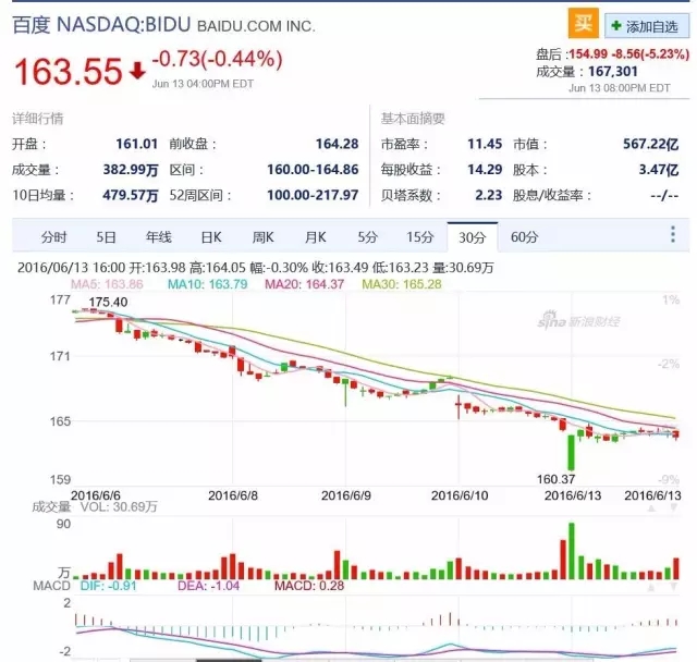 受此影響,百度股價在納斯達克周一開市后應聲暴跌了8%。