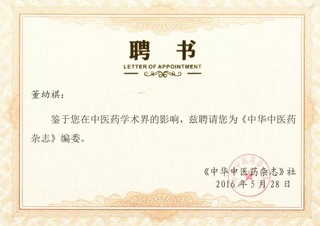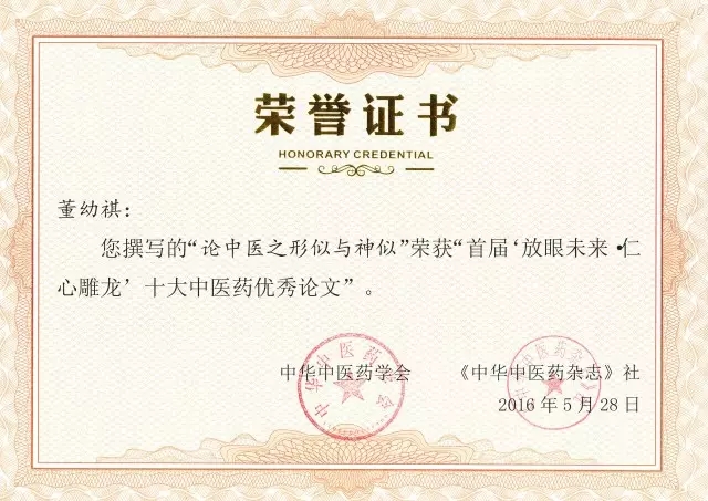 近日,董幼祺教授與遼寧中醫(yī)藥大學(xué)校長楊關(guān)林教授、原浙江中醫(yī)藥大學(xué)校長范永升教授、北京中醫(yī)藥大學(xué)副校長喬延江教授等一起受聘為《中華中醫(yī)藥雜志》編委,其撰寫的《論中醫(yī)之形似與神似》論文榮獲由中華中醫(yī)藥學(xué)會、《中華中醫(yī)藥雜志》社主辦,中國科協(xié)項目資助的首屆“放眼未來·仁心雕龍”論文評選活動的十大中醫(yī)藥優(yōu)秀述評論文獎。《中華中醫(yī)藥雜志》是中華中醫(yī)藥學(xué)會主辦的國家級高級中醫(yī)藥學(xué)術(shù)期刊,是中醫(yī)藥學(xué)科中的權(quán)威雜志。