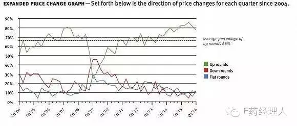 Fenwick&West律所對自2004年第一季度來融資情況作出統(tǒng)計,綠色代表上升輪公司所占比例,紅色代表下降輪公司所占比例。
