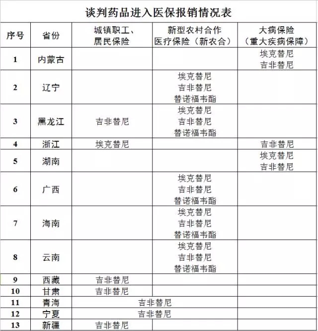 實際上,在談判開始前,一些地方已在探索通過不同保障形式將部分國家談判藥品納入當地醫(yī)保(新農合)報銷范圍。這些省份有內蒙古、黑龍江、浙江、湖南、廣西、西藏、甘肅、青海、寧夏、新疆。