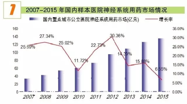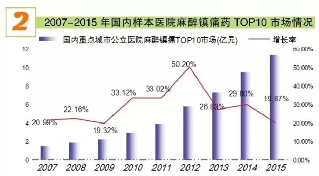 據(jù)米內(nèi)網(wǎng)HDM系統(tǒng)數(shù)據(jù),2015年國內(nèi)重點(diǎn)城市公立醫(yī)院神經(jīng)系統(tǒng)用藥市場規(guī)模為134.13億元,同比上一年增長了6.55%;其中,麻醉鎮(zhèn)痛藥市場有29個藥物,用藥金額為11.58億元,同比上一年增長了18.89%,遠(yuǎn)高于神經(jīng)系統(tǒng)用藥市場增長率,成為近年快速增長的品類。