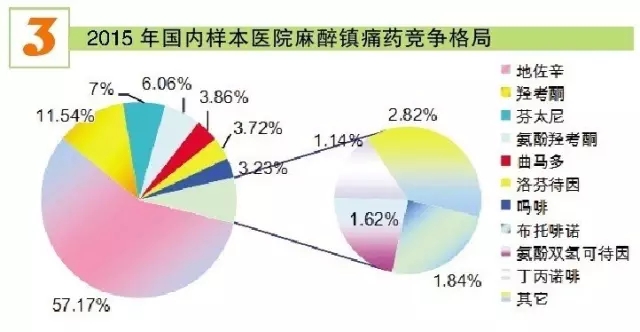 2015年,國內(nèi)樣本醫(yī)院麻醉鎮(zhèn)痛藥TOP10品種用藥金額11.25億元,占據(jù)該類市場97%。其中,居第一位的地佐辛就占據(jù)57.17%。