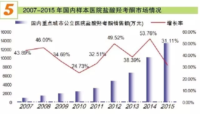 據(jù)HDM系統(tǒng)數(shù)據(jù),2015年國內(nèi)重點(diǎn)城市公立醫(yī)院鹽酸羥考酮用藥金額為1.34億元,同比上一年增長了31.11%;2011-2015年五年間年平均增長率為40.99%。國內(nèi)樣本醫(yī)院羥考酮市場主要由萌蒂(中國)制藥分銷的奧施康定把持,其中注射液占據(jù)26.02%,緩釋片劑占據(jù)73.98%。羥考酮控釋片可分別用于中、重度疼痛的第二、三階梯的止痛治療,而且可以與各種非阿片類鎮(zhèn)痛藥和輔助藥聯(lián)用。