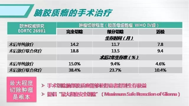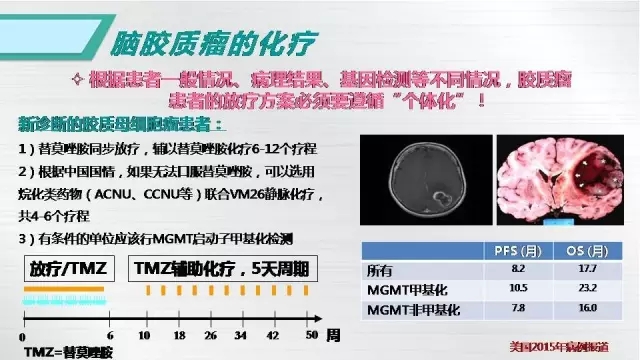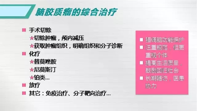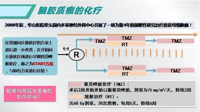 A:目前針對(duì)膠質(zhì)母細(xì)胞瘤,我們強(qiáng)調(diào)最大程度安全切除,即在確保腦功能不受影響的前提下,盡可能的擴(kuò)大切除腫瘤,然后采取標(biāo)準(zhǔn)的術(shù)后一個(gè)月開始同步放化療,結(jié)束后休息一個(gè)月進(jìn)行6個(gè)療程的輔助化療,化療藥物采用替莫唑胺口服,當(dāng)然,通過臨床研究顯示,目前比較推薦早期化療和長(zhǎng)周期輔助化療,即術(shù)后2周開始口服化療藥物,輔助化療延長(zhǎng)至12個(gè)療程,這種做法能夠延長(zhǎng)患者的生存時(shí)間。目前國(guó)際上對(duì)于膠質(zhì)母細(xì)胞瘤進(jìn)行了統(tǒng)計(jì),患者平均生存時(shí)間是15個(gè)月,但近年來隨著各類醫(yī)療技術(shù)的發(fā)展,患者的生存時(shí)間不斷延長(zhǎng),華山醫(yī)院現(xiàn)在膠質(zhì)母細(xì)胞瘤患者的平均生存時(shí)間可以達(dá)到19.8個(gè)月。未來如果配合合適的分子靶向治療和免疫治療,患者總體生存時(shí)間有望進(jìn)一步的延長(zhǎng)。