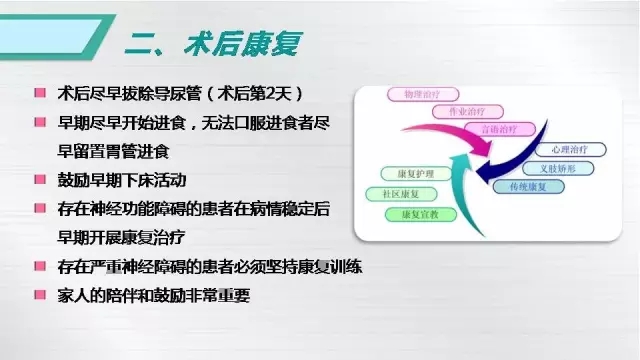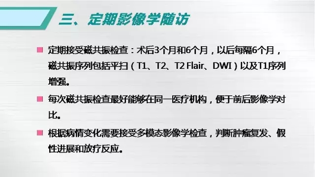 Q4:腦膠質(zhì)瘤術(shù)后需要注意什么?低級(jí)別腦膠質(zhì)瘤如果不治療,是否一定會(huì)發(fā)展成為高級(jí)別腦膠質(zhì)瘤?A:腦膠質(zhì)瘤術(shù)后特別需要注意三方面,第一是癲癇的控制,特別是術(shù)前和術(shù)后就存在癲癇發(fā)作的患者,一定要堅(jiān)持標(biāo)準(zhǔn)的抗癲癇治療,切勿輕易減量或者停藥;第二是密切隨訪,建議患者術(shù)后三個(gè)月、以后每六個(gè)月定期復(fù)查MRI,包括平掃和增強(qiáng);第三是針對(duì)存在神經(jīng)功能障礙的患者,術(shù)后堅(jiān)持康復(fù)訓(xùn)練非常重要,另外建立回歸社會(huì)的信心以及家人支持都非常重要。對(duì)于低級(jí)別膠質(zhì)瘤,特別是無癥狀、偶然發(fā)現(xiàn)的低級(jí)別膠質(zhì)瘤是否需要手術(shù),一直存在爭(zhēng)議,但是目前認(rèn)為這類患者應(yīng)該積極接受手術(shù)治療,因?yàn)榈图?jí)別膠質(zhì)瘤會(huì)不斷生長(zhǎng),絕大多數(shù)都會(huì)發(fā)生惡性變,發(fā)展成為高級(jí)別膠質(zhì)瘤,所以對(duì)于腦膠質(zhì)瘤仍然遵循早發(fā)現(xiàn)早治療的原則。