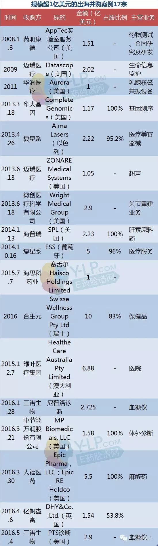 在此之前,復(fù)星的收購(gòu)是中國(guó)藥企海外并購(gòu)金額最大的紀(jì)錄保持者。2014年10月,復(fù)星旗下葡萄牙保險(xiǎn)公司Fidelidade通過競(jìng)爭(zhēng)性收購(gòu)?fù)稑?biāo),以總計(jì)4.6億歐元(約合人民幣36.13億元)的報(bào)價(jià),收購(gòu)葡萄牙醫(yī)療保健服務(wù)商ESS 96.07%的股權(quán)。此外,2016年5月16日,復(fù)星醫(yī)藥發(fā)布公告,稱全資子公司復(fù)星實(shí)業(yè)擬參與競(jìng)購(gòu)印度藥企Gland約96%股權(quán),報(bào)價(jià)高達(dá)12.7億美元。如若達(dá)成,這將是中國(guó)藥企首筆10億以上美元的海外藥企并購(gòu)交易。