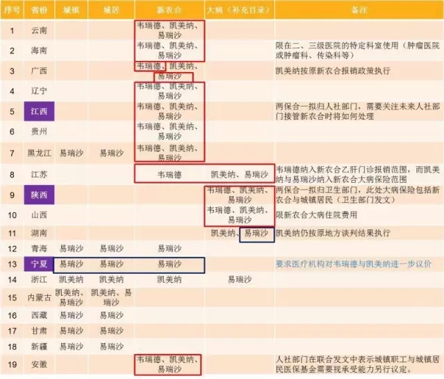 按照國家衛(wèi)生計生委口徑,至今日三個產(chǎn)品在各省被納入各類醫(yī)保合規(guī)費用范圍情況如下: