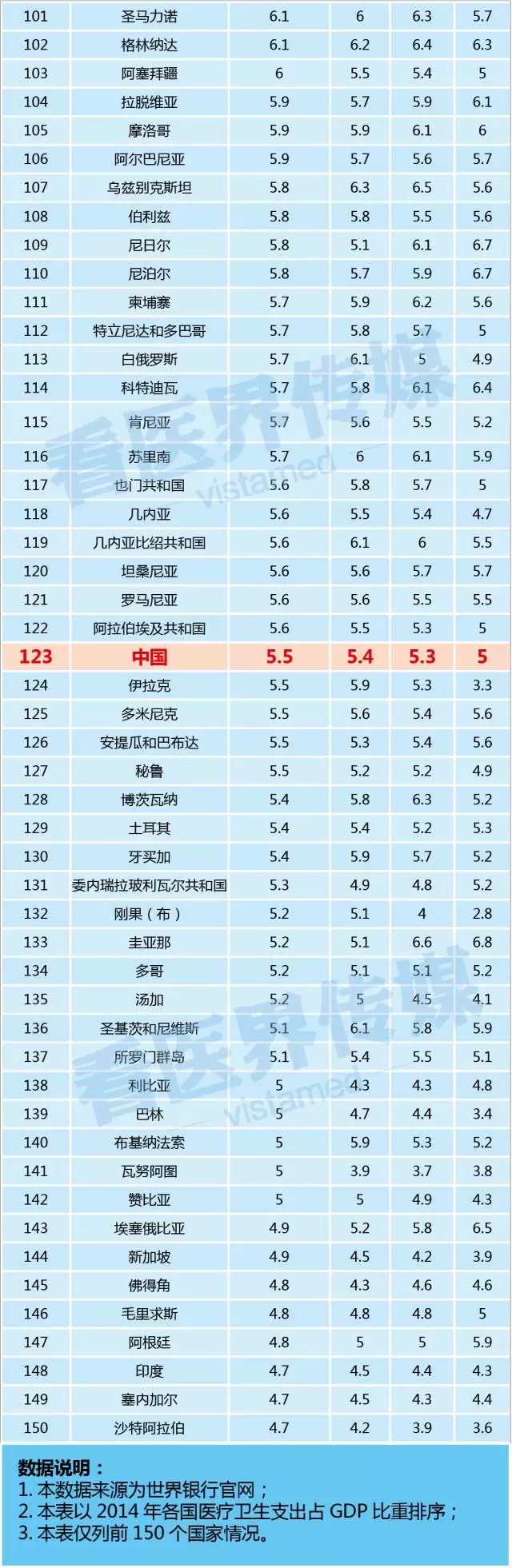 1、和世界銀行公布的數(shù)據(jù)相比,中國官方公布的2013年中國醫(yī)療衛(wèi)生投入占GDP數(shù)據(jù)為 5.57%,差了0.07%,可能是未及時更新,或省略了末尾數(shù)字。不過即使加上0.07個百分點,也不影響中國的排名。