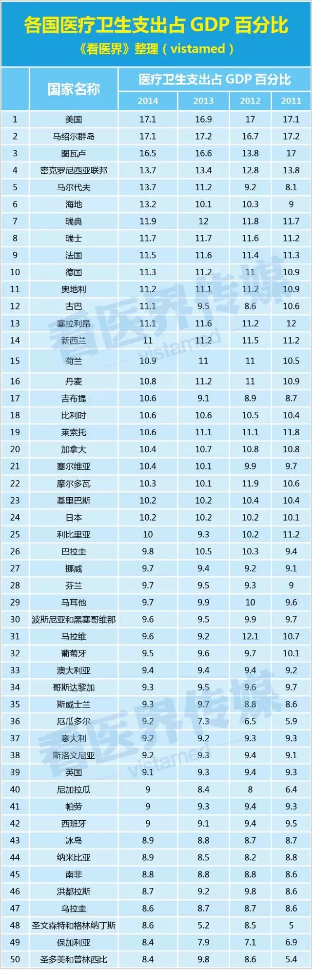 看,世界各國醫(yī)療衛(wèi)生投入排行榜