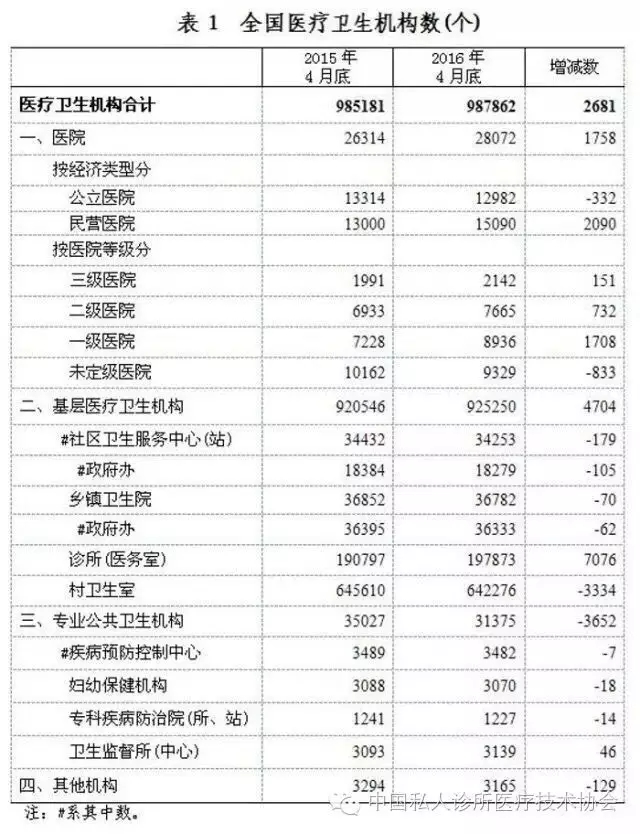 截至2016年4月底,全國醫(yī)療衛(wèi)生機(jī)構(gòu)數(shù)達(dá)98.8萬個(gè),其中:醫(yī)院2.8萬個(gè),基層醫(yī)療衛(wèi)生機(jī)構(gòu)92.5萬個(gè),專業(yè)公共衛(wèi)生機(jī)構(gòu)3.1萬個(gè),其他機(jī)構(gòu)0.3萬個(gè)。與2015年4月底比較,全國醫(yī)療衛(wèi)生機(jī)構(gòu)增加2681個(gè),其中:醫(yī)院增加1758個(gè),基層醫(yī)療衛(wèi)生機(jī)構(gòu)增加4704個(gè),專業(yè)公共衛(wèi)生機(jī)構(gòu)減少3652個(gè)。