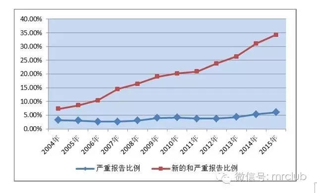 圖2 2004年-2015 年新的和嚴重以及嚴重藥品不良反應(yīng)/事件報告比例