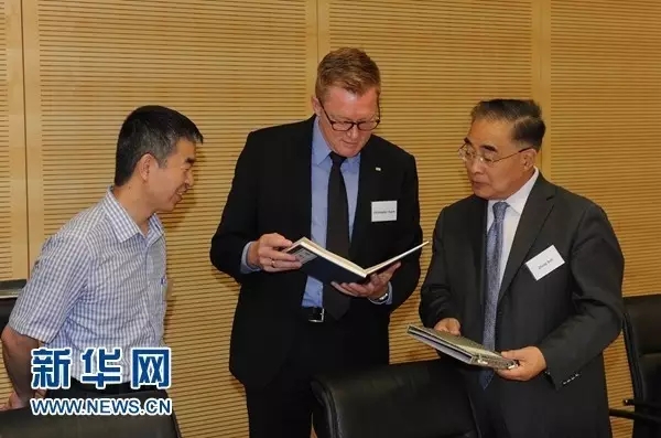 中國(guó)中醫(yī)科學(xué)院院長(zhǎng)張伯禮(右)與漢諾威醫(yī)科大學(xué)校長(zhǎng)克里斯托弗·鮑姆(中)交談