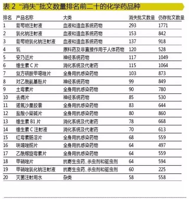 “消失”批文最多的前20位化學(xué)藥藥品基本上都是葡萄糖、氯化鈉等大輸液、維生素C、維生素B1等常用維生素以及土霉素、紅霉素等老藥,這些藥品并不需要500甚至1000家企業(yè)來生產(chǎn),估計(jì)后面還會(huì)有更多企業(yè)拋棄這類藥品的批文。