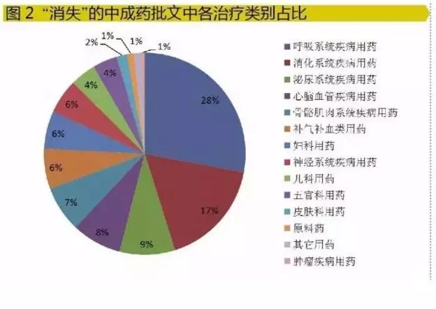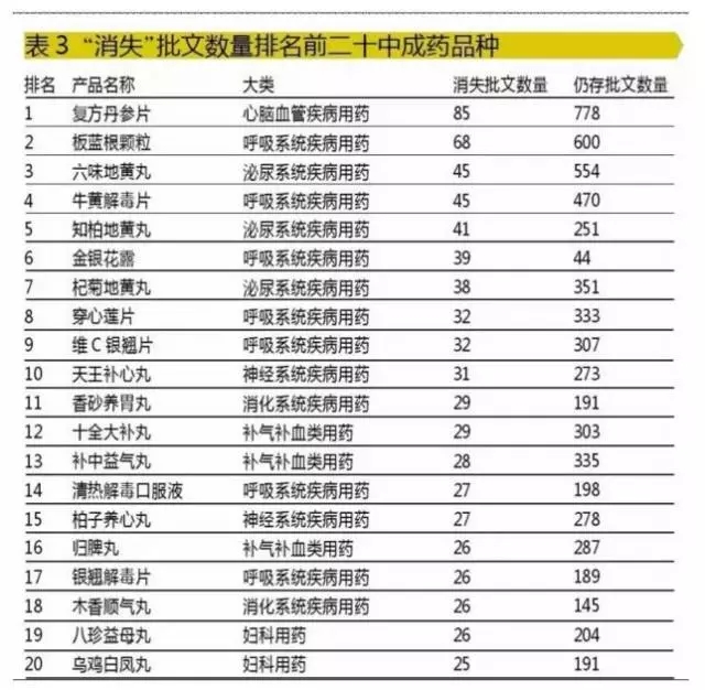 通過對(duì)“消失”的中成藥批文進(jìn)行分析,“消失”批文治療類別前三位分別是呼吸系統(tǒng)疾病用藥、消化系統(tǒng)疾病用藥、泌尿系統(tǒng)疾病用藥。其中,批文“消失”最多的品種有復(fù)方丹參片、板藍(lán)根顆粒、六味地黃丸等。