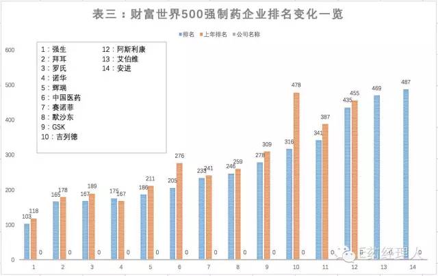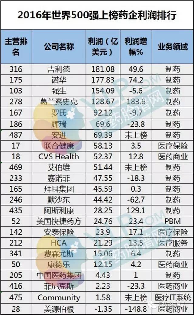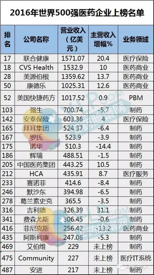 制藥企業(yè)中,艾伯維和安進(jìn)為首次登上世界500強(qiáng)榜單,分列第469位和487位。中國(guó)醫(yī)藥集團(tuán)連續(xù)第四年上榜,排名從2013年的第446位上升至2016年的第205位,前進(jìn)了241個(gè)身位。