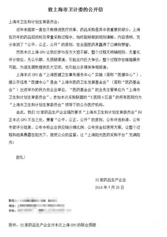 信中,32家藥品生產(chǎn)企業(yè)強(qiáng)烈要求“上海市衛(wèi)生和計(jì)劃生育委員會”糾正本次GPO不當(dāng)之處,秉著“公平、公正、公開”的原則,公布評選標(biāo)準(zhǔn)、公布專家評分結(jié)果、公布中標(biāo)企業(yè)供應(yīng)鏈分?jǐn)偙壤?、公布資金擬使用方案,讓整個(gè)過程和結(jié)果暴露在陽光下,接受公眾的監(jiān)督。