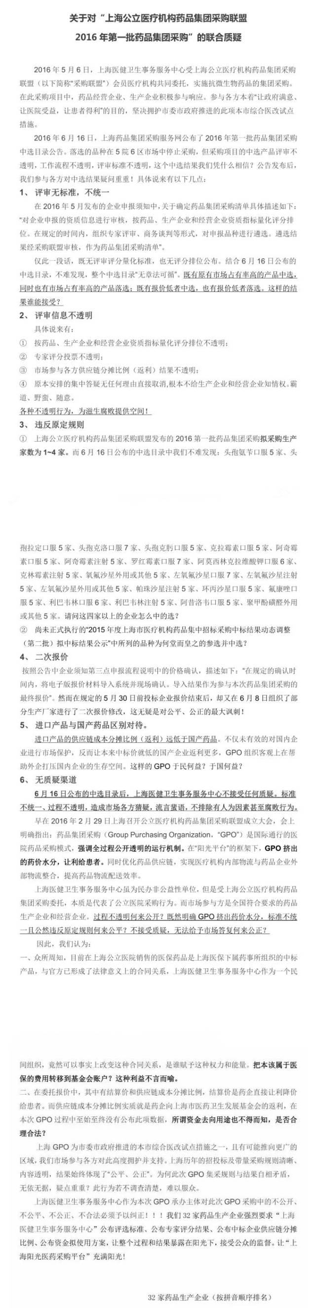 另外,一份《32家藥品生產(chǎn)企業(yè)對本次上海GPO的聯(lián)合質(zhì)疑》也傳播開來,與前日網(wǎng)傳的“上海GPO,一本好經(jīng)被念歪了!質(zhì)問上海醫(yī)健衛(wèi)生事務(wù)服務(wù)中心”一文內(nèi)容相符,印證了生產(chǎn)企業(yè)聯(lián)合質(zhì)疑上海GPO的傳聞。