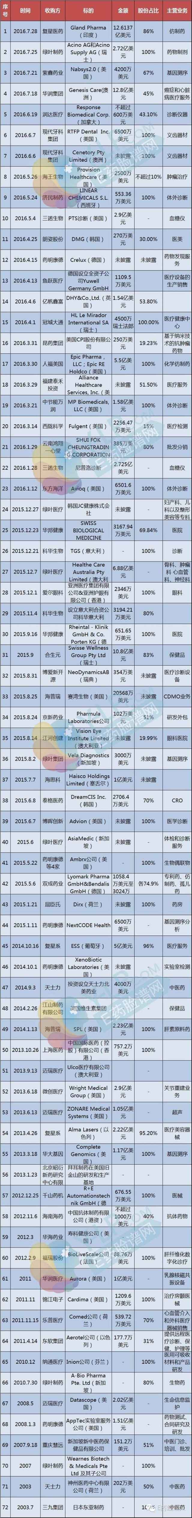 7月20日,《華爾街日?qǐng)?bào)》報(bào)道稱,華潤集團(tuán)牽頭的財(cái)團(tuán)正準(zhǔn)備收購澳大利亞癌癥療法提供商Genesis Car,將從KKR手中購得其所持有該公司的45%股份。據(jù)消息人士透露,該筆并購的價(jià)值是17億澳元,目前華潤組建的財(cái)團(tuán)已經(jīng)成為了優(yōu)先競標(biāo)人,距雙方簽署協(xié)議可能不會(huì)太遠(yuǎn)。7月21日,三諾生物公告稱,其向美國PTS公司支付了全部股權(quán)并購款項(xiàng)共計(jì)1.1億美元。7月22日,紫鑫藥業(yè)發(fā)布公告稱,擬以4200萬美元收購美國Nabsys 2.0公司67%股權(quán)。7月25日,綠葉集團(tuán)宣布,與瑞士Acino公司簽約,以2.45億歐元購買旗下透皮釋藥業(yè)務(wù)。