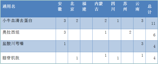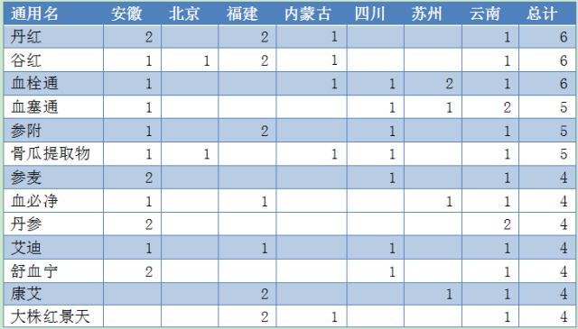 共有13個產(chǎn)品通用名在2015年各地的重點藥品或目錄或輔助用藥目錄中出現(xiàn)頻率較高。此13個產(chǎn)品基本都屬于“活血化瘀”類藥和腫瘤輔助用藥。其中丹紅注射液、谷紅注射液、注射用血栓通(凍干)、參附注射液、血必凈注射液、艾迪注射液、舒血寧注射液、康艾注射液和大株紅景天注射液都是獨家產(chǎn)品。
