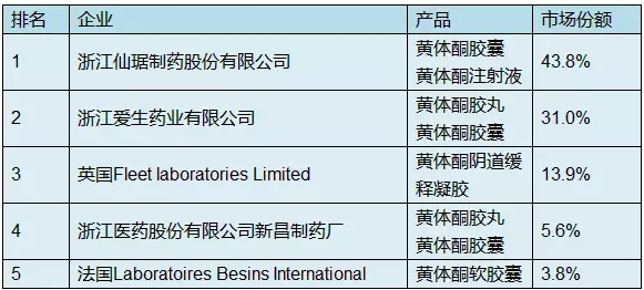 中康CMH數(shù)據(jù)顯示,國內(nèi)黃體酮市場份額TOP5企業(yè)的累計(jì)市場份額98.1%,其中浙江仙琚制藥的市場份額最高,達(dá)到43.8%,是國內(nèi)唯一一家同時(shí)拿到黃體酮膠囊和黃體酮注射液生產(chǎn)批文的企業(yè)。
