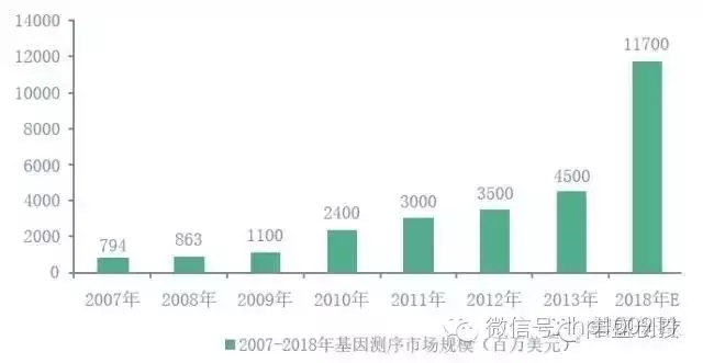 基因測序行業(yè)發(fā)展迅速,二代測序為主流技術?,F(xiàn)下,一代基因測序技術由于通量較低、測序時間較長,已經(jīng)不能滿足研究應用的需要,以高通量低成本為特征的二代測序技術為目前應用最廣泛的測序技術,測序時間相較于一代技術大大降低?;驕y序作為精準醫(yī)療的重要一環(huán),隨著技術的進步以及成本的下降,近年來發(fā)展迅速,據(jù)BBCRESERCH統(tǒng)計,從2007年的7.94億美元增長到2013年的45億美元,復合增長率為33.5%,預計未來幾年依舊會保持快速增長,2018年將達到117億美元,復合增長率為21.1%。