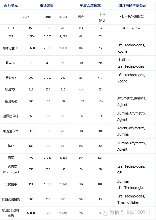 基因測序技術將成為未來分子診斷的核心平臺。從基因檢測的市場容量和年復合增長率來看,二代測序及數(shù)字PCR一直以來都保持50%的市場增速。未來,隨著測序技術水平提升,成本下降,計算能力提高,2017年測序技術將取得超過34億美元的市場容量。