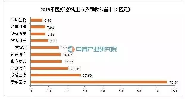 中商產(chǎn)業(yè)研究院數(shù)據(jù)庫數(shù)顯示,2015年國內(nèi)醫(yī)療器械公司收入最高的為新華醫(yī)療,為75.54億元,遠(yuǎn)高于其他醫(yī)療器械企業(yè)收入。