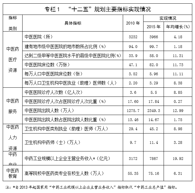 “十二五”時期是中醫(yī)藥發(fā)展進程中極具歷史意義的五年,中醫(yī)藥發(fā)展國家戰(zhàn)略取得重大突破,中醫(yī)藥事業(yè)獲得長足發(fā)展,基本形成中醫(yī)藥醫(yī)療、保健、科研、教育、產(chǎn)業(yè)、文化整體發(fā)展新格局,對增進和維護人民群眾健康的作用更加突出,對促進經(jīng)濟社會發(fā)展的貢獻明顯提升,“十二五”規(guī)劃確定的主要目標和任務全面完成。