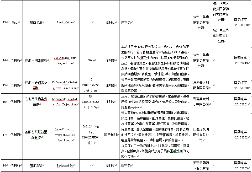 總局批準(zhǔn)上市藥品公告(2016年第133號(hào))