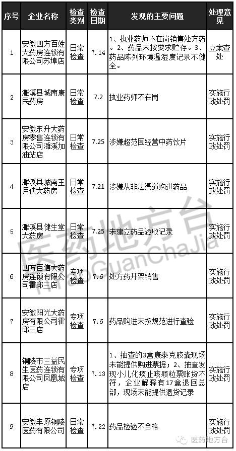 8月17日,安徽省藥監(jiān)局局藥化流通監(jiān)管處發(fā)布《2016年7月藥品流通監(jiān)督檢查信息》,通報(bào)省局、17個(gè)市(縣)局對(duì)藥品流通企業(yè)的檢查情況,檢查范圍包括日常檢查、飛行檢查、專項(xiàng)檢查、跟蹤檢查、認(rèn)證檢查、專項(xiàng)整治等。