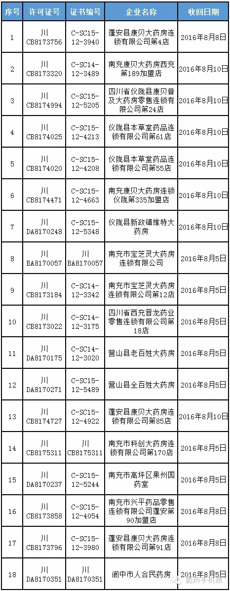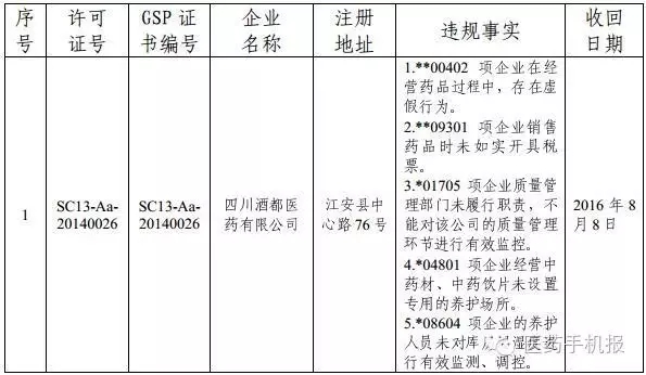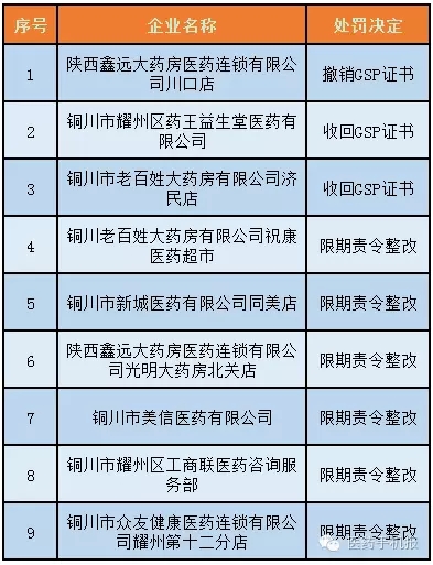 8月15日,陜西省銅川市藥監(jiān)局發(fā)布《關(guān)于對2016年第二輪藥品零售經(jīng)營企業(yè)飛行檢查結(jié)果的通告》,7月底至8月初開展的第二輪飛檢涉及全市3個區(qū)縣、9家藥品零售經(jīng)營企業(yè)。其中,有1家被撤銷GSP證書、2家被收回GSP證書、6家被責(zé)令限期整改。