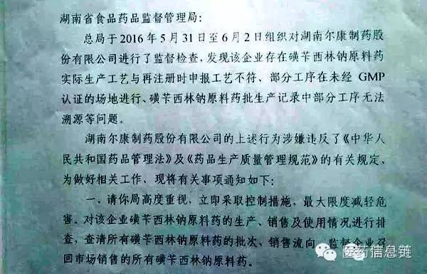 在對(duì)爾康制藥的查處《通知》中,國家食藥監(jiān)總局責(zé)令湖南食藥監(jiān)局立即采取控制措施,最大限度減輕危害。要求對(duì)爾康制藥的原料藥生產(chǎn)、銷售及使用情況進(jìn)行排查,查清所有原料藥的批次、銷售流向,監(jiān)督企業(yè)召回市場(chǎng)銷售的所有原料藥。同時(shí)責(zé)令使用該原料藥的相關(guān)制劑生產(chǎn)企業(yè),配合做好相關(guān)藥品召回工作。