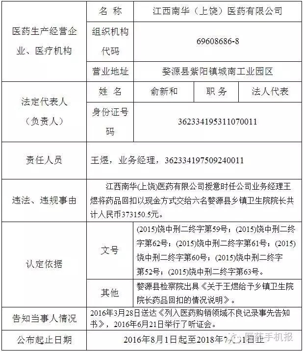 2016年8月10日,江西省衛(wèi)計(jì)委向國家衛(wèi)計(jì)委報送了《醫(yī)藥購銷領(lǐng)域商業(yè)賄賂不良記錄報送表》。江西南華(上饒)醫(yī)藥有限公司授意時任公司業(yè)務(wù)經(jīng)理王煜將藥品回扣以現(xiàn)金方式交給6名婺源縣鄉(xiāng)鎮(zhèn)衛(wèi)生院院長共計(jì)人民幣373150.5元,被列入江西省醫(yī)藥購銷領(lǐng)域商業(yè)賄賂不良記錄。