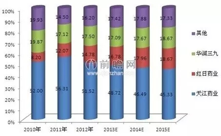 2010-2015年中藥配方顆粒競爭格局及預(yù)測(單位:%)