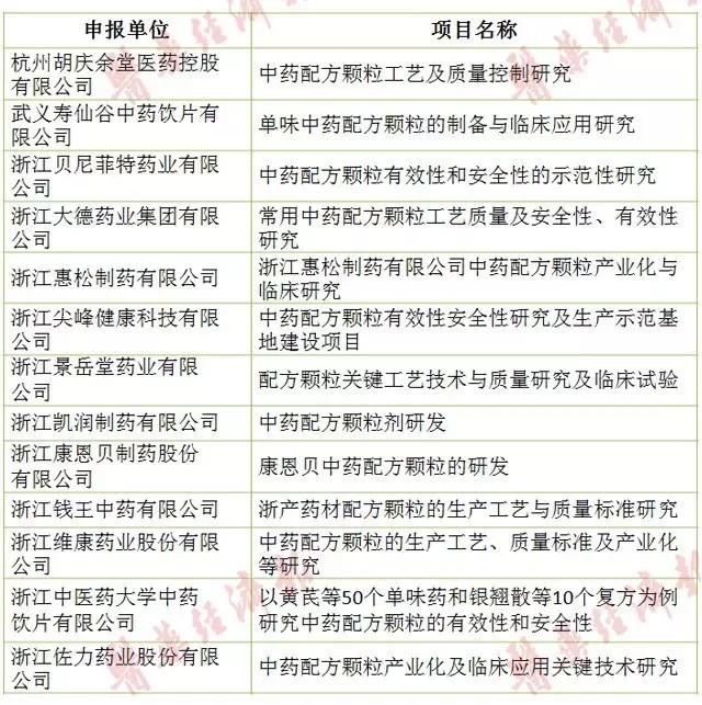 此外,僅浙江一省申報申報中藥配方顆??蒲袑m椀钠髽I(yè)就達(dá)13家之多(詳見下表)。